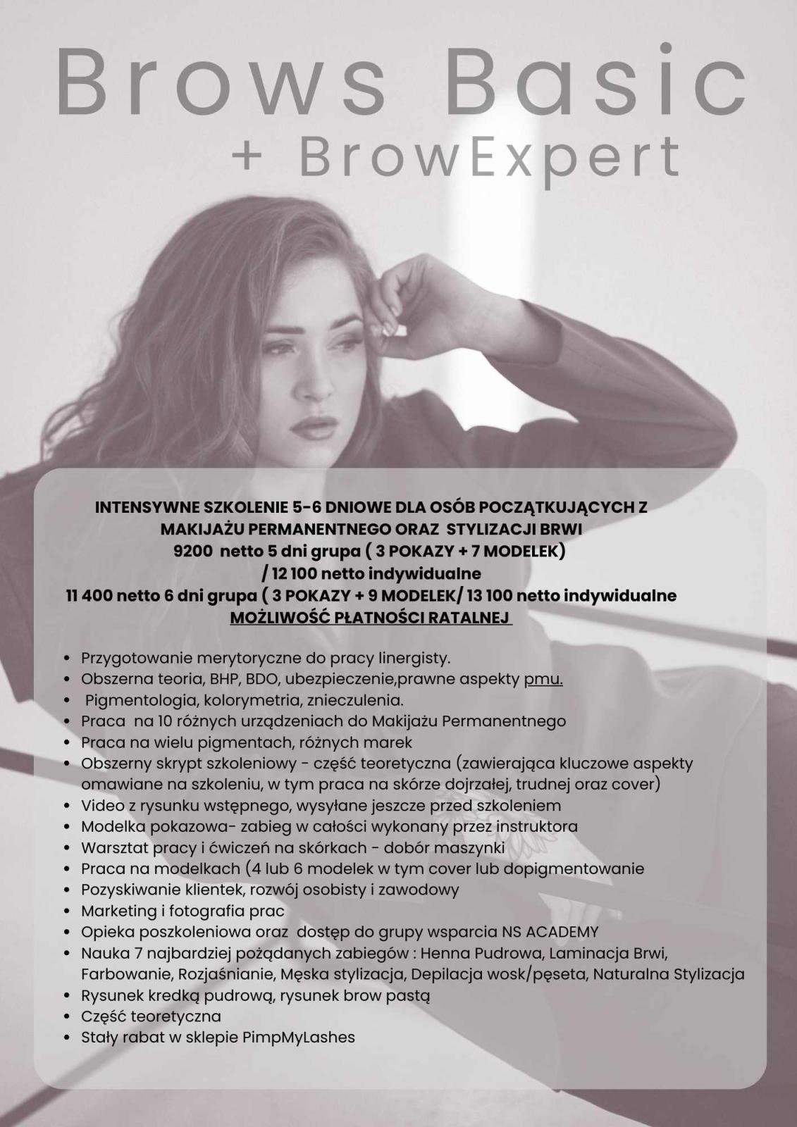 Brows Basic + BrowExpert to kompleksowe, 5–6-dniowe szkolenie dla osób zaczynających pracę w makijażu permanentnym i stylizacji brwi. Program łączy pełną teorię PMU, pigmentologię i kolorymetrię z intensywną praktyką: pracą na urządzeniach, różnymi pigmentami, ćwiczeniami na skórach oraz modelkami, a także modułem BrowExpert obejmującym szeroki wachlarz technik stylizacji brwi.