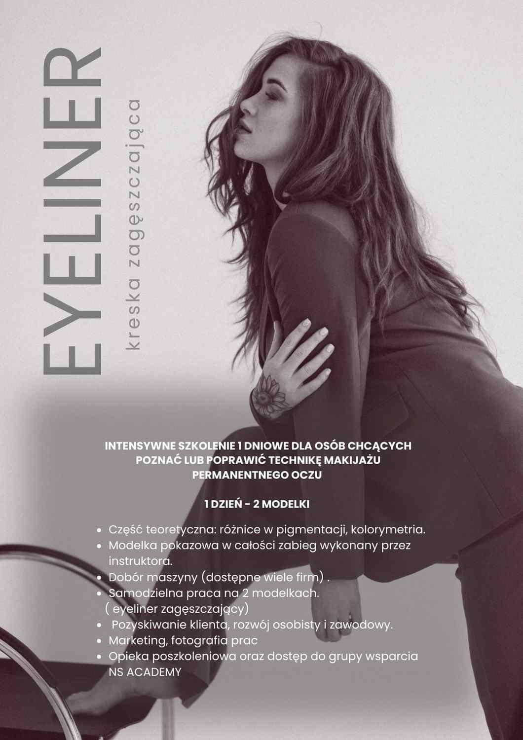 Szkolenie EYELINER to intensywny jednodniowy program dla osób chcących poznać lub udoskonalić technikę makijażu permanentnego oczu. Łączy teorię pigmentacji z praktyką: pełnym pokazem zabiegu, doborem maszyn oraz samodzielną pracą na dwóch modelkach w technice kreski zagęszczającej, uzupełnioną o elementy marketingu i fotografii prac.