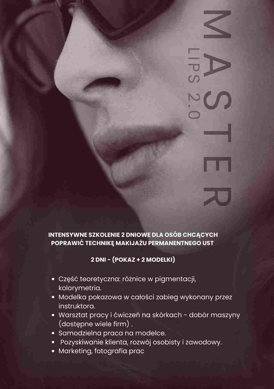 MASTER Lips 2.0 to dwudniowe szkolenie dla osób, które chcą świadomie udoskonalić technikę makijażu permanentnego ust i pracować bardziej precyzyjnie. Program łączy zaawansowaną teorię pigmentacji z praktyką: pełnym pokazem zabiegu, ćwiczeniami na skórach i samodzielną pracą na modelkach, uzupełnioną o aspekty marketingu i rozwoju zawodowego.