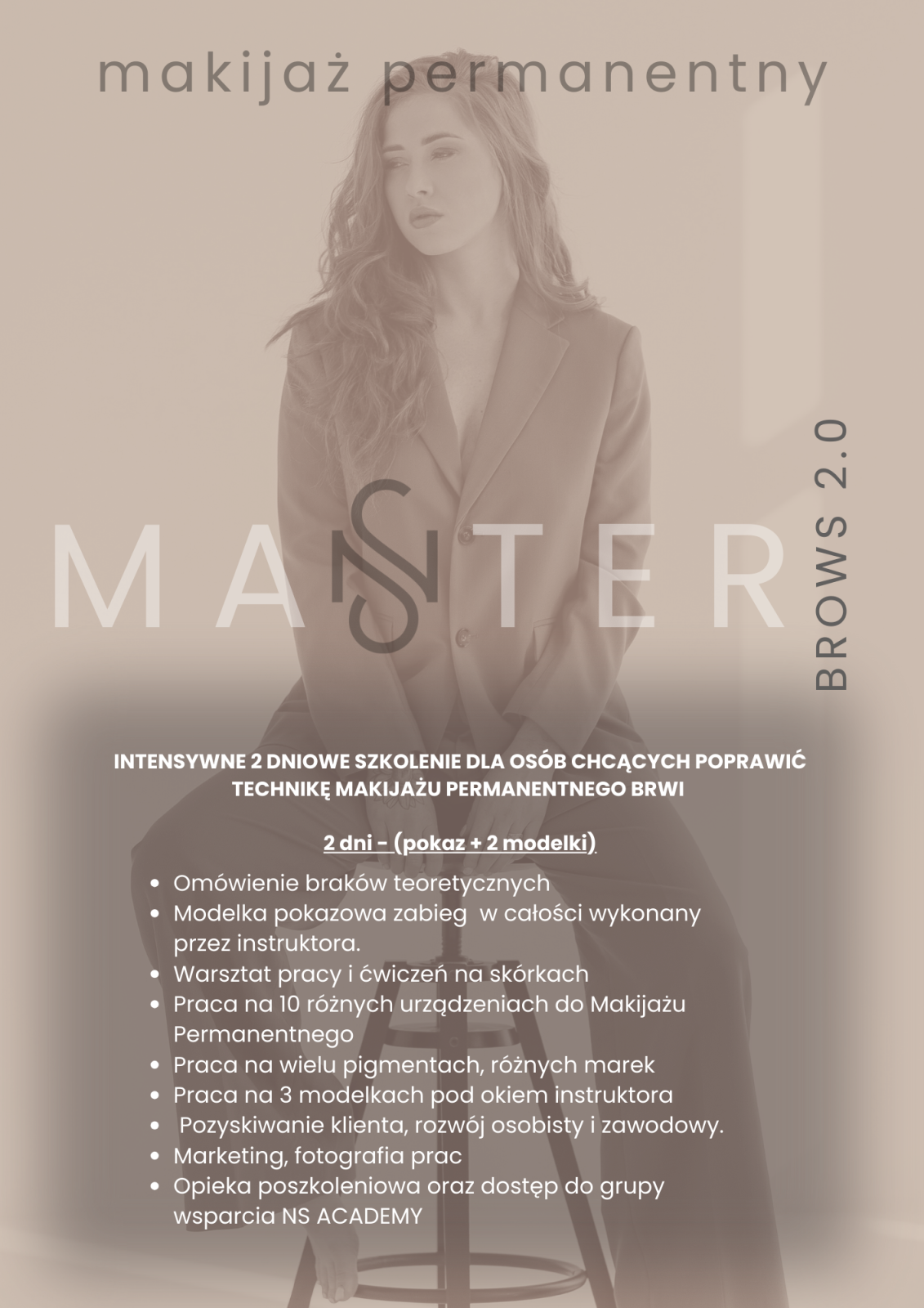 Szkolenie MASTER Brows 2.0 to dwudniowy program dla osób pragnących dopracować technikę brwi PMU i pracować bardziej świadomie oraz precyzyjnie. Obejmuje analizę braków teoretycznych, pełny pokaz zabiegu, intensywne ćwiczenia na skórach oraz praktykę na wielu urządzeniach i pigmentach. Uczestniczki wykonują prace na trzech modelkach pod stałą kontrolą instruktora. Program rozwija zarówno umiejętności techniczne, jak i kompetencje biznesowe, a jego uzupełnieniem jest opieka poszkoleniowa i dostęp do grupy wsparcia NS Academy.