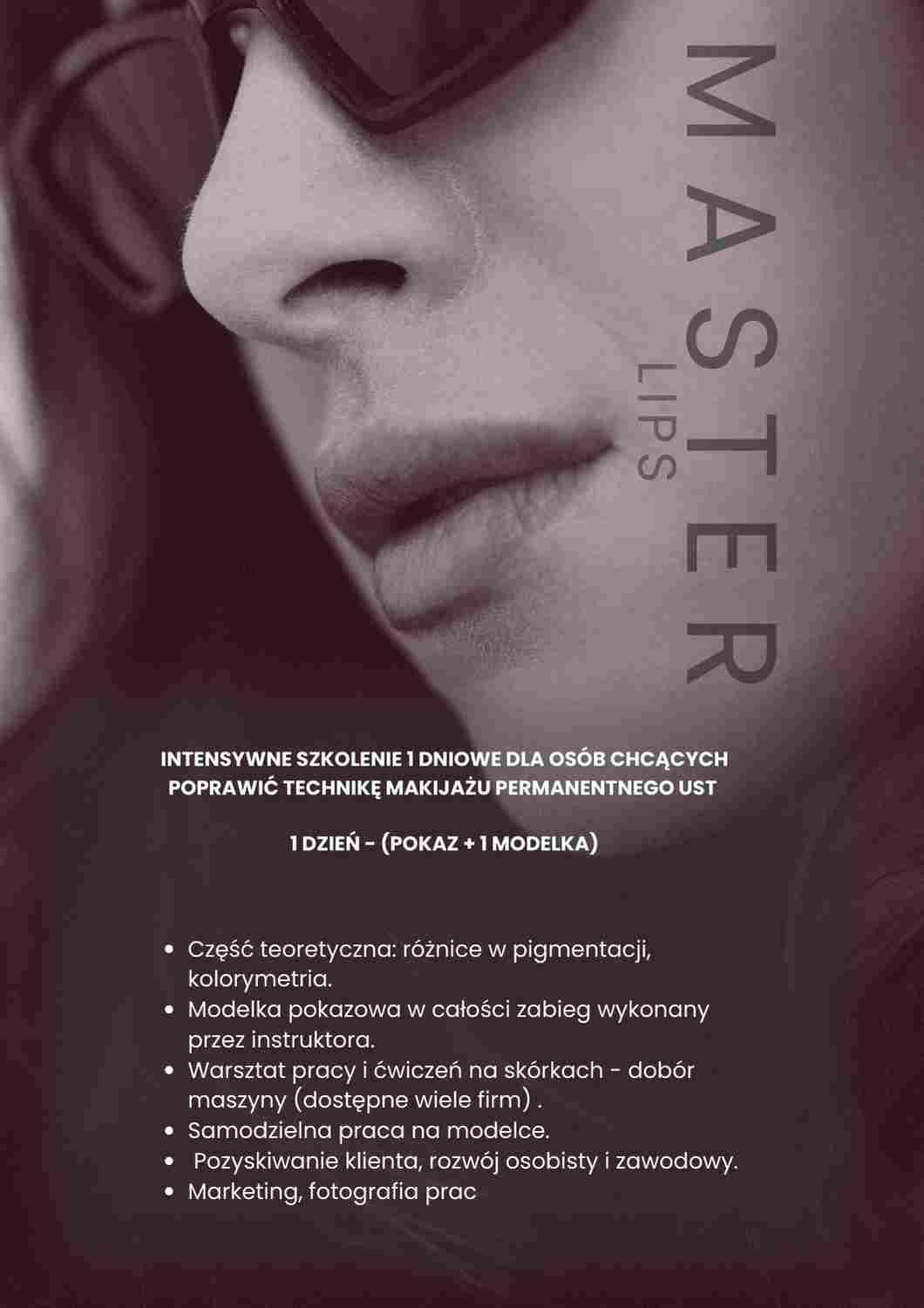 MASTER Lips to intensywne jednodniowe szkolenie stworzone dla osób chcących udoskonalić technikę makijażu permanentnego ust. Program łączy precyzyjną analizę pigmentacji z praktyką: pełnym pokazem zabiegu, ćwiczeniami na skórach i samodzielną pracą na modelce, uzupełnioną o elementy marketingu i fotografii prac.
